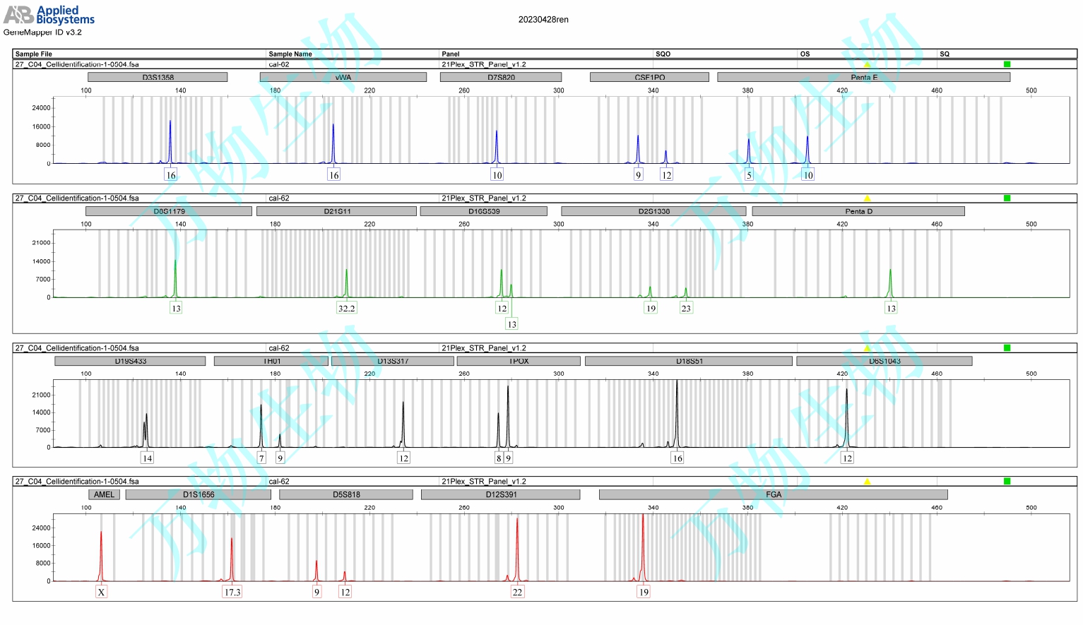 經(jīng)本庫STR檢測(cè)結(jié)果如下:D5S818: 9,12;D13S317: 12,12;D7S820: 10,10;D16S539: 12,13;vWA: 16,16;THO1: 7,9;Amelogenin: X,X;TPOX: 8,9;CSF1PO: 9,12 |