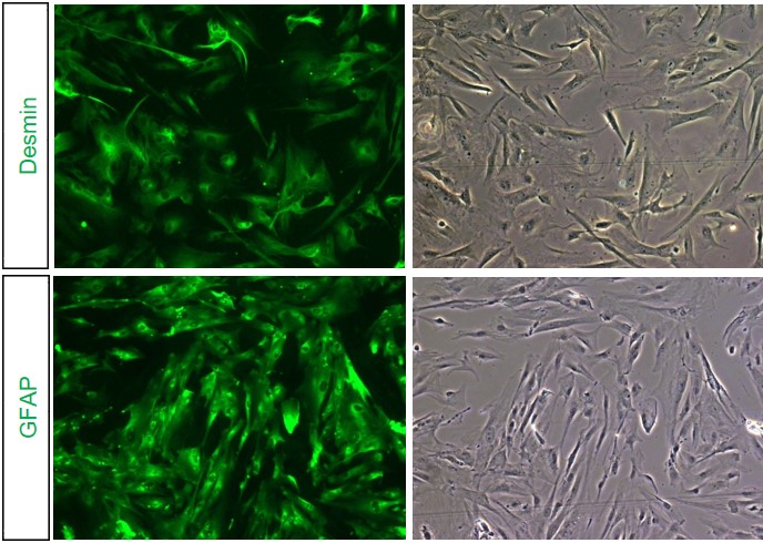 圖1。人肝星狀細(xì)胞(HHSC)用HSC標(biāo)記物染色,包括圖示的結(jié)蛋白和GFPA(綠色)。每個(gè)染色的相位對比圖像顯示在右側(cè)面板上。