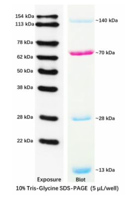 本產(chǎn)品Western Protein Marker I為預(yù)染可曝光蛋白marker,由8種高純度的非預(yù)染重組蛋白(含His標(biāo)簽)和4種預(yù)染重組蛋白(無His標(biāo)簽)組成,指示的蛋白質(zhì)分子量大小為13-154 kDa(~13、22、28、~28、38、50、62、~70、78、113、~140、154 kDa),其中70 kDa為玫紅色預(yù)染條帶,13、28、140 kDa均為藍(lán)色預(yù)染條帶,方便動態(tài)觀察蛋白質(zhì)電泳狀態(tài)或判斷蛋白質(zhì)轉(zhuǎn)膜效果。8條非預(yù)染重組蛋白可以結(jié)合幾乎所有類型抗體(雞抗體除外),可與目的蛋白質(zhì)同時結(jié)合抗體并經(jīng)ECL或其他方式顯色。